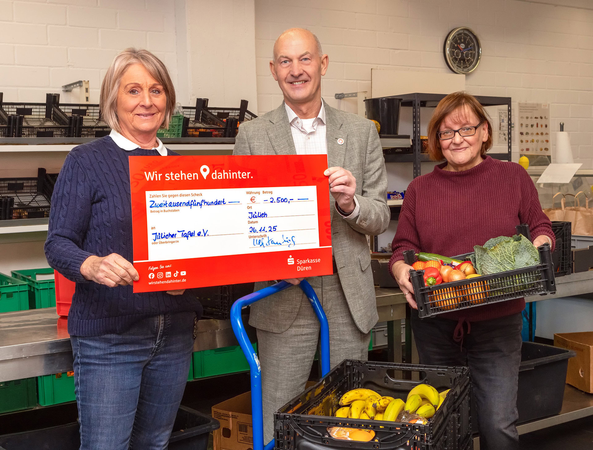 Jülich. Ein warmes Mittagessen auf dem Tisch, Geld für frische Lebensmittel, ein gefüllter Kühlschrank: All das ist für viele Menschen in Jülich nicht selbstverständlich. Sie können sich solche Dinge nur leisten, da sie von der Tafel unterstützt werden. Rund 1.500 Menschen, denen es finanziell nicht so gut geht, versorgt der Verein zurzeit regelmäßig mit Nahrungsmitteln. Doch um dieses Hilfsangebot leisten und aufrecht erhalten zu können, sind auch die Ehrenamtler der Tafel auf Unterstützung angewiesen. Ein wichtiger Partner sind dabei die Stadtwerke Jülich. Gerade erst hat der Lebensversorger 2.500 Euro an die Tafel gespendet.